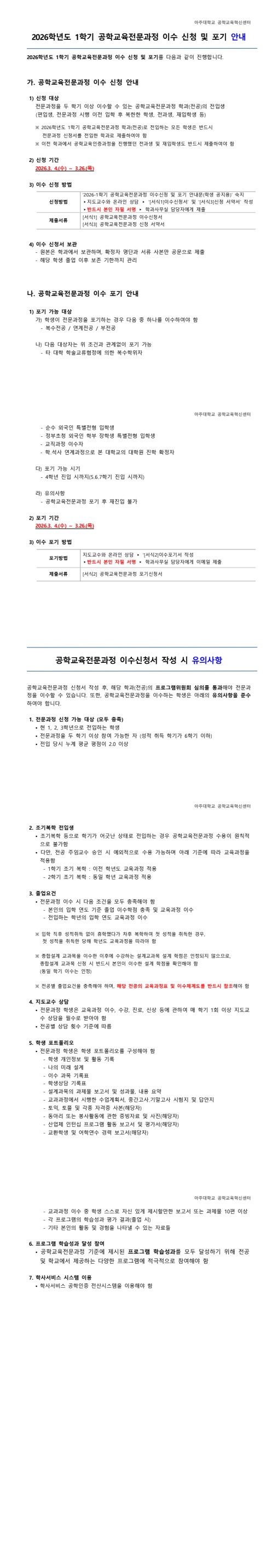 2026학년도 1학기 공학교육전문과정 이수 신청 및 포기 안내